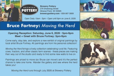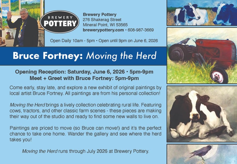 Come early, stay late, and explore "Moving the Herd", an exhibit of original paintings by local artist Bruce Fortney. All paintings are from his personal collection! Moving the Herd brings a lively collection celebrating rural life. Featuring cows, tractors, and other classic farm scenes - these pieces are making their way out of the studio and ready to find some new walls to live on.