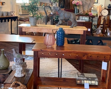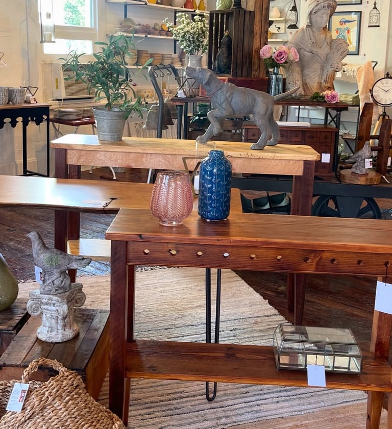 Unique and traditional handmade wooden furniture detailed with antiqued hardware. Unusual home goods help showcase the handmade items.