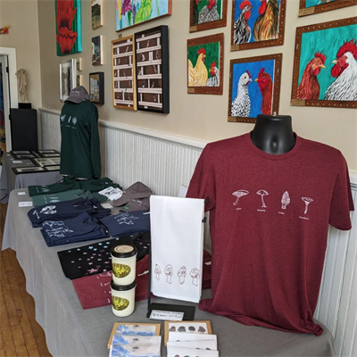 Colorful paintings, illustrations, books, posters, shirts, and more.